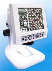8.4インチの液晶モニタ(解像度 800×600)搭載の一体型マイクロスコープ。 4分割独立点灯方式のLEDリング照明、18倍〜120倍ズームレンズも標準装備。 液晶モニタにはビデオならではの滑らかな動画を表示。工場の検査ラインなどに最適。 |