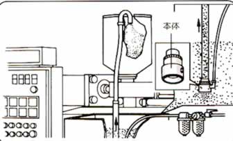ペレットの空気搬送機 圧縮空気配管を繋ぐだけで、成型機のホッパーにペレットを簡単に搬送できる経済的な方法です。 |