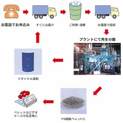 | ■ご注文からの流れ ●溶かした生成分は、再資源化でリサイクル 回収後のドラム缶は、国内の再生工場で溶剤とPS樹脂ペレットに分離。ペレットは玩具やカセットテープケースなど に再商品化されます。 ![]() |
