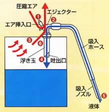 ⑥液体が満杯になると浮き玉がエア排出口を塞ぎ吸引停止
