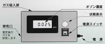 | ■特徴 ●安全レベルをランプで確認できます。 緑:0~0.025ppm 黄:0.025~0.05ppm 赤:0.05ppm以上 ●定量吸気ファンを内蔵し、高速で安定したオゾン検出を実現しました。 ●測定範囲は作業・生活環境の安全確認に適した0~0.25ppmとしました。 ■操作部 ![]() ■仕様