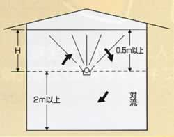 | ■空気殺菌用 空気殺菌は室内上層空間を照射することにより、空気中に浮遊する細菌を減少し、対流によって清浄化することが できます。殺菌灯は食品工場、医薬工場、病院、調理室などで使用されています。 ![]() ■設置目安 床面積20m2当たり1台。但し取付位置の高さ床から2.0m以上、天井から0.5m以上とする。 ![]() |