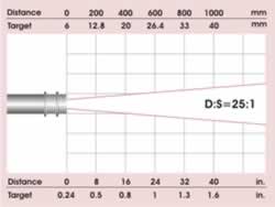 測定温度範囲 -40〜600℃ 測定視野範囲 φ40mm/1000mm(測定視野範囲図参照) 測定精度 ±1%もしくは±1℃のどちらか大きい方(周囲温度23℃±5℃,測定温度-20℃以下を除く) 再現性 ±0.5℃もしくは±0.5℃のどちらか大きい方 応答時間 12ms(90%応答) 8ms(63%応答) アナログ出力 チャンネル1:4-20mA/0〜20mA/0-5V/0-10V/熱電対J・K出力(測定対象物温度) チャンネル2:0-5V/0-10V(センサヘッド温度) 分解能 0.1℃ 信号処理 ピークホールド/バレーホールド/アベレージング 測定波長 8〜14μm 放射率補正 0.100〜1.100 透過率補正 0.100〜1.100 使用周囲温度 センサヘッド:-20〜120℃ アンプユニット0〜65℃ 使用周囲湿度 10〜95%RH(結露なきこと) 保護構造 IP65(NEMA-4) 材質 センサヘッド:ステンレス アンプユニット:亜鉛ダイキャスト 電源電圧 8-36VDC 出力インピーダンス 電流(ループ抵抗500Ω以下)電圧(負荷インピーダンス100KΩ以上)熱電対(20Ω) 外形寸法 センサヘッド:φ28×14mm(M12×1) アンプユニット:120 mm x 80 mm x 40 mm 質量 センサヘッド:約40g アンプユニット:約450g