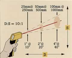 | ■光学分解能 本器は、近距離の対象物を測定するのに最適です。対象物からの距離が離れれば離れるほど、測定エリアは大きく なります。 例えば距離が250mmの場合、測定エリア径は25mm、距離が500mmですと、測定エリア径は50mmとなります(下図 参照)。 オフセット1点レーザーは測定エリアのおおよそその中心を示します。
