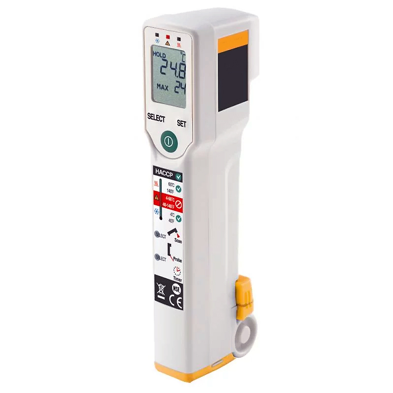 高精度で表面温度を測定できる非接触式温度計。 手洗いが可能 HACCPチェック・ライトを装備しており、ライトが緑または赤に光ることで、在庫時の温度が安全か危険かを示します。 |