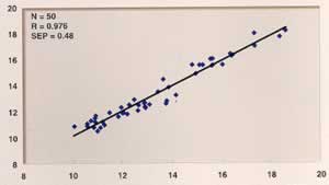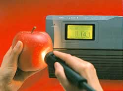 | ■りんごをはじめ、桃やナシなど色々なくだものに対応できる、各種ソフトウエアの開発に成功。 ■果実を傷つけることなく、樹に実ったままの果実の糖度も簡単に測れる「光反射式糖度計」は、その最高の成熟状態をおしえてくれます。また、甘さが確認された高品質なものを自信をもって出荷することができます。 「光反射式糖度計」は計画的収穫と高値取引を実現し、生産者の方が大切に育んだ果実の価値を高めます。また、消費者の方にとっては安心してお求めになれるなど、「光反射式糖度計」はくだもの市場の活性化に大いに貢献します。 ■光反射式糖度計と糖度(BRIX)の関係 ![]() ![]() ■もっと手軽に甘さを測れる、そんな糖度計が欲しい。 これまでの糖度計は測定するのに大変な手間と時間がかかり、果実を傷つける(破壊)タイプが主流でした。また、大規模な設備システムで時間がかかり価格もとても高いのが、非破壊タイプでした。さらに、いままでの糖度計はすべて樹に実ったままの状態を測ることはできませんでした。 そのため、特に生産者の方々をはじめ多くの皆様から、果実を傷つけずにもっと手軽に糖度が測定できないものかとの声が寄せられていました。 そこで当社では平成元年から青森県産業技術開発センターとの共同研究を開始し、青森職業能力開発短期大学校の支援により平成8年までに試作品を完成させました。その後も性能及びデザインに至るまで様々なモニター調査、アンケート調査を重ね、平成11 年、ついに発売に至ったのです。 ■優れた特長 表面に光センサーを当てスイッチを押すだけで、糖分が吸収する光の成分の変化量を読み取って、果実の糖度を約3秒で演算処理を行いデジタル表示します。長い間期待されていた糖度計。 ■新機能 ●ソフトウェアの増加で、様々な果実に対応。 ・リンゴ・桃・梨・マンゴー等の糖度が計れます。 ●生産地域に応じた微調整機能付 ●ついに実現!ハンディタイプ 重さ約 1.2kg と軽量なため、屋外にも携帯できます。 ●果実を傷つけずに測定 樹に実ったままの果実の糖度も測定できます。 ●ラクラク簡単操作 ペンライト状のオペレーター部分を果実の表面に当ててスイッチを押すだけで、簡単に測定できます。 ●約3秒でデジタル表示 素早く糖度がデジタル表示されます。 ●目にやさしい照射光 ソフトな光(0.6W)を使用していますので、長時間操作をしても目に安全です。 ●リーズナブルなお求めやすさ 各生産者の方が購入しやすい価格に設定しました。 ![]()