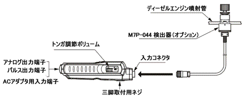 サイクルディーゼルエンジンの回転数測定専用に設計されたハンディタイプのディジタル回転計。 M7P-044 検出器 (別売)を燃料噴射管の1本にワンタッチ装着するだけで r/min 直読のエンジン回転数測定が可能です。 |
