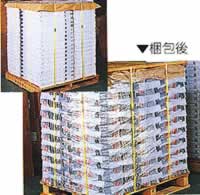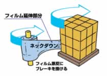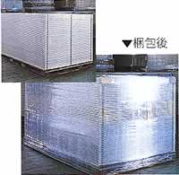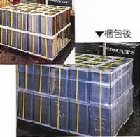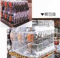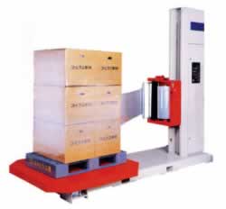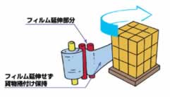 | ■特徴 1. パレットストレッチ包装機は貨物の形状・種類を問わず、同じフィルムで連続して包装できます。 しかも、1パレットの作業時間が約2分程と早く、包装作業を大幅に省人化します。 2. パレットストレッチ包装機はフィルムの収縮性を生かし、テンションを加える事によって貨物をきっちり固定し、荷崩れを防止します。またフィルムの自己粘着性により保持力がアップします。 3. パレットストレッチ包装機は透明フィルムの使用により、内容物の識別が容易です。 また、開梱時も積荷を傷つける事なく、カッターナイフ1本で積荷を解くことができます。 4. パレットストレッチ包装機は本機を最終包装ラインに組み込む事により、資材・人手・時間の大幅な省力化が図られるのはもちろん、内容物のチェック、輸送の安全性など物流全体のスピード化、経費の合理化に役立ちます。 ■包装方法