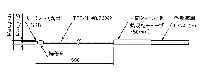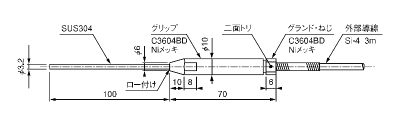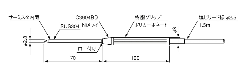 ■オプション ●標準センサー/M813XB-54 ハンディタイプのセンサで最も利用範囲が広い形状です。 保護管の先端が尖っており、被測温体に突き刺して測定します。 ![]() ●液体温度測定用センサー/M813XA-46 外部導線の取り外し部をグランド防滴処理したもので、液中(水、油)の温度を測定するのに適したセンサです。 グランドパッキング方式の防滴型としては小型です。 グランド防滴部の耐熱温度は100℃までです。100℃以下でご使用下さい。 ![]() ●気体温度測定用センサー/M813ZL-64 サーミスタが露出しており気体、表面温度の測定で非常に高感度であることを必要とする時使用します。 (但し、防水性はありません。) フレキシブルな構造のため、屈曲した部分や湾曲した部分の測定にも適しています。 ![]() ●耐食・耐薬品用センサー/M813XK-67 フッ素樹脂電線の先端にサーミスタが封入してあります。 センサ自身がフレキシブルな構造で、湾曲した部分やパイプ内部などの測定に適しています。 耐薬品性、耐熱性にすぐれています。 ![]() ■仕様