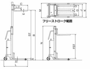 ■従来型はフォークを上昇させると同時に2段目マストが上がるため、マストの出っ張りが天井に当たり、高く揚げら れなかった。 本シリーズはフォークのみが上昇する為2段目マストの出っ張りが邪魔すること無く、高くフォークを上げることが出 来、棚を有効に使うことが出来ます。 ●荷物を高く揚げようとすると、2段目マストが天井に当たり使えない。 ![]() ●2段目マストの出っ張りが無い為、天井近くまで荷物を揚げることができる。 ![]() ■寸法図 ![]() |