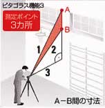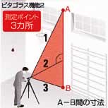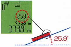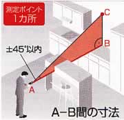 | ■測定機能 ●距離 ●面積 ●容積 ●計算 ●最大値/最小値 ●連続測定 ●傾斜測定 ●間接測定 ●ピタゴラス ●メモリー ●タイマー ●距離アラーム ●IP54 ■チルトセンサー搭載 ●傾斜測定 ・±45°までの傾斜測定が可能です。(精度±0.3°) ![]() ●間接測定<1種類> A-C間を測定することにより簡単にA-B間の距離がわかります。 ![]() ●ピタゴラス機能測定<3種類>※1 ピタゴラス機能を使えば、離れた場所からでも、2ヵ所または3ヵ所の測定値により建物の幅や高さが測定できます。 ![]() ![]() ![]() ※1:推定距離を算出する機能であり、実測値とは異なります。 ●距離設定アラーム機能付 連続測定に設定した距離とその倍数値の±100mm前後でブザー音が鳴るように設定できます。 ![]() ●自動バックライト付液晶ディスプレイ 暗い部屋などではセンサーにより、自動でバックライトと測定ボタンが点灯します。 ●ポジショニング・プラケット 入り隅などのコーナー測定や縁掛けでの引っ掛け測定が可能です。 ![]() ■製品仕様