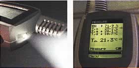 | ■計測&表示項目 ●相対湿度:%-Rh ●周囲温度:℃-Ta ●表面温度:℃-Ts(接触計測) ●結露温度:℃=Td ●結露温度と表面温度の差:℃-T△ 内臓メモリー、自動計測機能、バッチ保存機能、分析ソフト ■使い方 ●電源を入れる ![]() ●画面が表示される その場で測定できるMeasureモードを選択します。 ![]() ●OKボタンを押す ほとんどの操作はこの大きな3つのキーで行えます。 ![]() ●先端のセンサーを 先端に表面温度、内部に周囲温度と湿度用センサーを装備。 ![]() ●測定対象に当てる 先端の表面温度用センサーを測定対象に当てるだけ。 ![]() ●測定値を確認する 結露温度と実際の表面温度の差が小さいときは要注意! ![]() ■多彩な機能の一部をご紹介 ●3つの測定モード 通常の測定の他に便利な記録モードが2種。 マニュアルモードでは測定中にボタンを押した時点の値が時刻とともに記憶、インターバルモードでは設定した 一定時間ごとに値が自動記録されます。 ![]() ●バッチ機能 データを区分けして記憶させることが可能。測定部位ごと、製品種ごと、塗装種ごと・・・品質管理に便利です。 左図の例は建設機械メーカーです。タンク、デッキ、リア、フロントに分けて記憶させています。 ![]() ●アラーム機能 音と光と画面表示でお知らせ。表面温度、△T温度など各指標ごとに設定が可能です。 バッチごとに異なる限界値を設定することも可能。 タンクの塗装では表面温度、リアの塗装では△Tに限界値を設定する・・・などが可能です。 ![]() ●便利な機能も充実してます。 ![]() ■拡張機能も優れたもの ●DewCheck Dock この多機能の拡張ユニット(オプション)を本体背面にドッキングさせることで付加機能が利用できます。 ![]() ●USBコネクター ドックにUSBコネクターが装備。PCと連携し、付属ソフトでグラフ化やデータのダウンロードなどが行えます。 ![]() ●外部センサー ドックに自動計時に便利な外部センサーが付属。 さらにドック背面のマグネットを利用して鉄素地に本体を固定することも可能です。 ![]() ■仕様