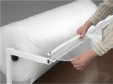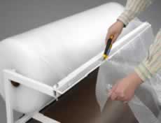 | ■使用方法 @前方上部の押さえ金具を持ち上げて、エアークッションを挟み押さえ金具を下ろして固定します。 ![]() A固定しているエアークッションを両手で左右を持ち、梱包に必要な長さに引っぱり出します。 ![]() B引っぱり出されて固定しているエアークッションをガイドの中にカッターを入れて連続的にカットできます。 ![]() |