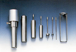 M92-LT形はとくに低粘度を高精度に測定するのに最適な機種で、M92-LTアダプタと組み合わせて使用します。このM92-LTアダプタは取り付け枠1個、底開放形および底密閉形スリーブ各1本、ロータ1本で構成されています。密閉形を使用すればサンプル量20Pで測定できます。また開放形を使用する場合はそのまま試液中に浸して測定します。