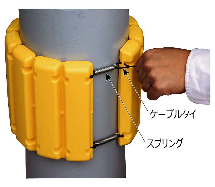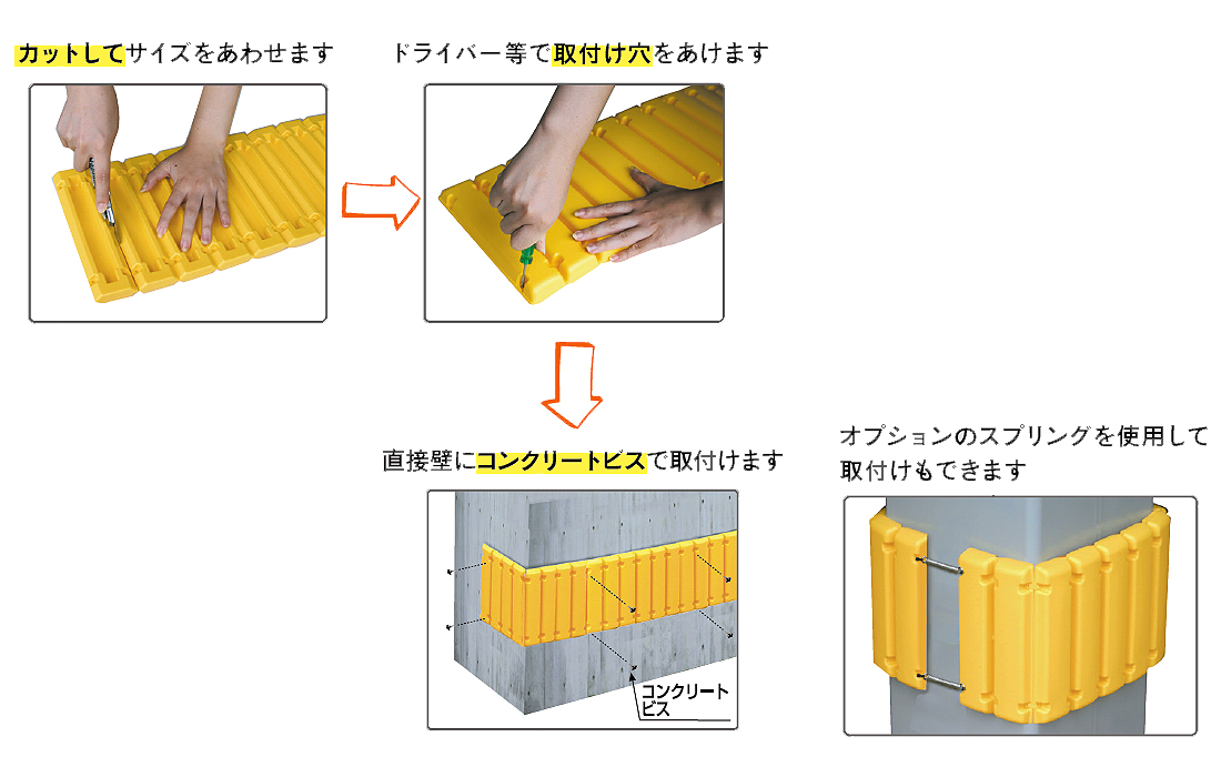 | ■特長 ●どんな場所でも取付簡単。 ![]() ●柱と車両との衝撃を和らげるプロテクター。 ●軟質ポリエチレンを素材にし、中空構造を採用しています。 ●衝撃に対し、人・車などのダメージを和らげることができます。 ■用途 街灯・照明・ポールサインの柱などのプロテクトに。 ![]() ■取付方法 ![]() ■寸法図 ![]() ■仕様