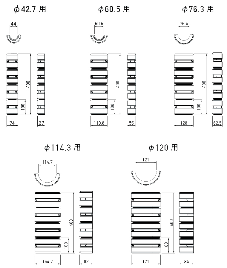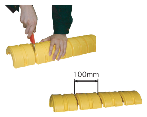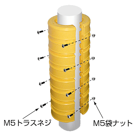 | ■特長 ●衝撃に対し人・車などへのダメージを和らげるプロテクター。 ●軟質ポリエチレンを素材にし、中空構造を採用しています。 ●パイプの太さに合わせて5種類のタイプがあります。 ●反射シート(オプション)を張り込むことで誘視効果が高まり、パイプの存在を知らせ、追突を防ぎます。 ■取付方法 パイプを両側から挟み込み、サイドをネジでとめます。 パイププロテクターは100mmごとにカットすることができます。用途に合わせてカットし、ご使用ください。 ![]() ![]() ■使用例 ![]() ■寸法図 ![]() ■仕様