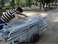 無舗装路の運搬にはお困りでは? きっとお役に立ちます。 ●テント、パネル、カーペット、テーブル等、長尺物の運搬に最適です。 ●大きなタイヤで芝生や地面をあまり傷付けません。 (チューブレスなので、パンクの心配がありません) ●手すりは抜き差しできるので、コンパクトに保管できます。 ●必要に応じ、台上や段差越えにコンパネ等を敷いて御使用下さい。 |
