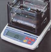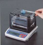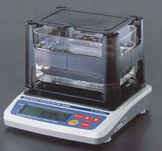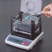 | <機能> 1.最小比重、体積を0.01まで測定できます。 2.最大300gまで測定できます。 3.コンパレータ機能を追加、測定結果の合否判定が可能になりました。 4.インターフェイス標準装備により、コンピュータとの接続が簡単になりました。 5.スチロール製水槽を採用しているので耐医薬品性に優れ、エタノールなどの溶剤も、測定用媒体として使用できます。 6.水に浮く物も瞬時に測定できます。 7.測定値の更新が出来ます。 ■測定手順 ①測定物を載せる ![]() ②測定物を水槽に入れる ![]() ③比重が表示されます ![]() ■仕様