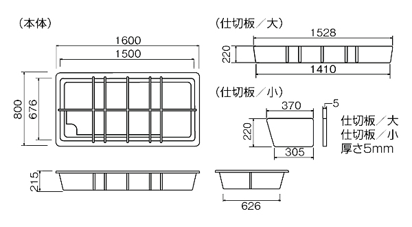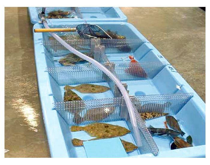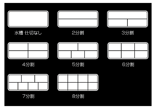 | 見やすい低構造と分割自在の仕切版で品質管理に最適。 用途にあわせて、自由に分割できます。 ![]() ■特長 ●仕切板を移動すれば2~8分割まで、ご使用にあわせて自在に分割ができます。 内容物の種類や大きさなど、様々な分類ができ、セリ場などの状況に即対応できます。 ![]() ![]() ●分割自在の仕切り板 仕切板は取り外し可能です。また、表面孔加工により、水槽内の水がスムーズに循環します。 ![]() ●魚市場などでの環境整備に 収穫物を大小や種類ごとに陳列する際に見やすい水槽です。魚市場などでの環境整備にお役立てください。 ![]() ●オーバーフロー排水 水位を保ちながら排水します。全部排水する場合は、オーバーフロー管を除けば排水します。 ![]() ■オプション ●排水キャップ 排水キャップ方式は、水圧が大きい場合でも簡単に排水できます。 ![]() ■仕様