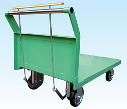 ハンドストッパー付運搬車は、ハンドルを握ると動き、放すとストッパーが掛かる機構になっており、ストッパーを掛ける煩わしさや、ストッパーの掛け忘れ防止にもなります。 |