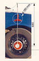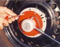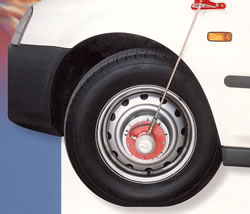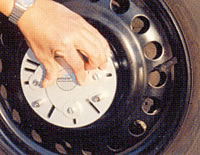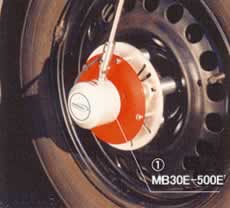 取付けプレートとホイル回転センサーをホイルに取り付けた後、写真(左)のように回転センサーに付属している吸盤式取付け部品によって、容易にフェンダーに装着できます。 |