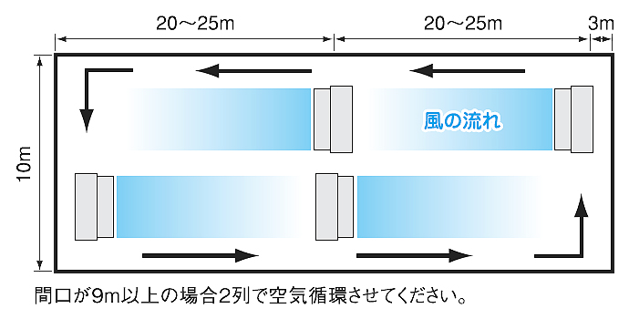 循環扇として専用設計したプロペラファンと効率的な空気の流れを生むフロントガイドベーンの組み合わせにより、作物にやさしい風をハウスのすみずみまで効果的に循環させます。![]() ■特長 ●耐久・安全性を重視した全閉型モーターを採用 ●床置き、天吊りの2Wayタイプ 建物内の梁等を利用し天井吊り下げタイプとして設置可能。省スペースで送風、循環に使用可能です。 ![]() ●夏場の高温対策 空気を循環させることにより温室内の温度ムラを解消し、夏場の局所的な高温状態を改善する効果があります。 ●冬場の暖房の効率化 温室上部にある暖かい空気を下の方に循環させることにより、暖房の効率化が図れます。 ●梅雨時・冬場における空気の淀みを解消 梅雨時・冬場閉めきった温室の空気の淀みを解消し、病害を防ぐ効果が期待できます。 ●葉面境界層※の破壊による光合成の促進と病害の発生防止 作物の表面にできる葉面境界層(高温度層)を循環する空気の流れで破壊し、作物の光合成を促進し病害を防ぎます。 ※葉周辺の空気の流れが少なく、高湿度な空気が葉の表面に淀んだ状態をいいます。 ●接触刺激による徒長(作物の葉・茎が無駄に伸びること)の防止と生育の均一化 空気の流れにより葉と葉が接触し、接触刺激による徒長防止と生育の均一化が図れます。 ![]() ●100V仕様は強弱スイッチ付き ※3相200V仕様にはスイッチは装備されていません。 ![]() ■仕様