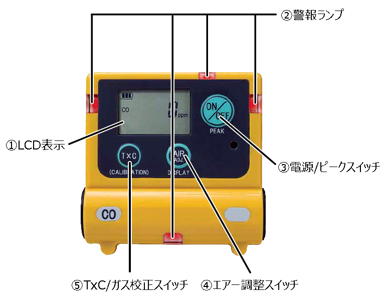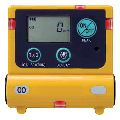| ■特長 ●作業者をまもるポケットサイズの一酸化炭素計。 ●厚さ22mm、重さ75gの超薄型・軽量タイプ。 ●単4形アルカリ電池1本で約5,000時間の連続使用可能。 ※無警報時(ガス濃度表示が20ppm以下)、20℃の場合 ●4方向のランプ、ブザー、バイブレーションで警報をお知らせ。 ●COの積算濃度表示機能、ピーク値メモリ機能、ピークホールド機能搭載。 ●ガス校正がお手元で可能 (別売りキット使用)。 ●本質安全防爆構造(Ex ib IIB T3) ●安全ピンアダプタは標準付属品です。 ![]() ■側面 ![]() ■機能 ●積算濃度(TxC)表示機能 ⑤を押すと、T:ガスの暴露時間(hr)×C:CO濃度(ppm)で割り出した積算濃度を表示します。積算濃度が150ppm・h以上に達すると警報でお知らせします。 ●ピーク値メモリ機能 ③と④を同時に押している間、画面に[PEAK]の表示が点滅し電源ONから現在までのピーク値(最大値)および経過時間を表示します。スイッチを離すと、通常のガス濃度表示に切り替わります。 ●ピークホールド機能 ③を一度押すと、画面に[PEAK]の表示がされ、その間のピーク値(最大値)を常に表示します。もう一度PEAKスイッチを押すと、通常のガス濃度表示に切り替わります。 ![]() ■一酸化炭素の知識 ●一酸化炭素中毒の危険性 CO中毒とは、不完全燃焼等により発生したCOを含んだ空気を吸入した場合に起こる中毒です。 COはヘモグロビンとの結合力が強い為、少量を吸入しても血液中の酸素運搬能力が著しく損なわれ、酸素欠乏を起こすといわれています。その症状は、濃度と吸入時間に大きく左右され、さまざまな症状を起こします。 ●一酸化炭素の人体に与える影響