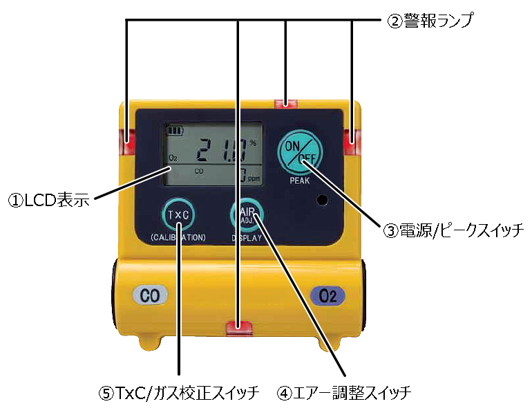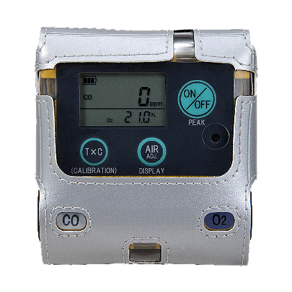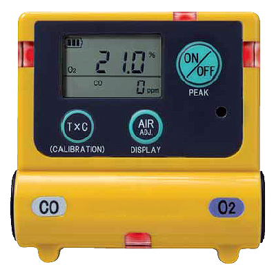 | ■特長 ●作業者をまもるポケットサイズで、酸素と一酸化炭素を同時検知・同時表示。 ●厚さ22mm、重さ75gの超薄型・軽量タイプ。 ●単4形アルカリ電池1本で約5,000時間の連続使用可能。 ※無警報時(ガス濃度表示が20ppm以下)、20℃の場合 ●4方向のランプ、ブザー、バイブレーションで警報をお知らせ。 ●COの積算濃度表示機能、ピーク値メモリ機能、ピークホールド機能搭載。 ●ガス校正がお手元で可能 (別売りキット使用)。 ●本質安全防爆構造(Ex ib IIB T3) ●安全ピンアダプタは標準付属品です。 ![]() ■側面 ![]() ■機能 ●積算濃度(TxC)表示機能 ⑤を押すと、T:ガスの暴露時間(hr)×C:CO濃度(ppm)で割り出した積算濃度を表示します。積算濃度が150ppm・h以上に達すると警報でお知らせします。 ●ピーク値メモリ機能 ③と④を同時に押している間、画面に[PEAK]の表示が点滅し電源ONから現在までのピーク値(最大値)および経過時間を表示します。スイッチを離すと、通常のガス濃度表示に切り替わります。 ●ピークホールド機能 ③を一度押すと、画面に[PEAK]の表示がされ、その間のピーク値(最大値)を常に表示します。もう一度PEAKスイッチを押すと、通常のガス濃度表示に切り替わります。 ![]() ■酸素欠乏の人体に与える影響