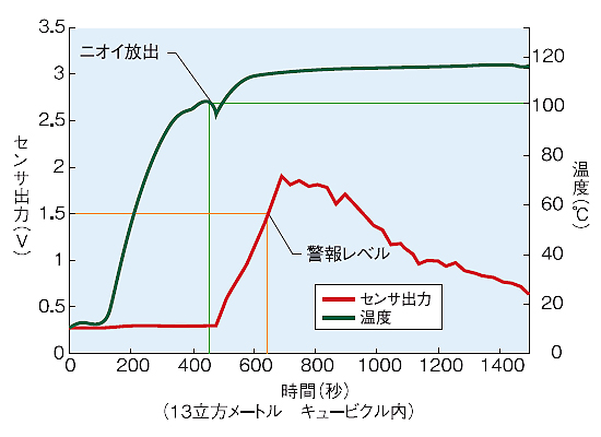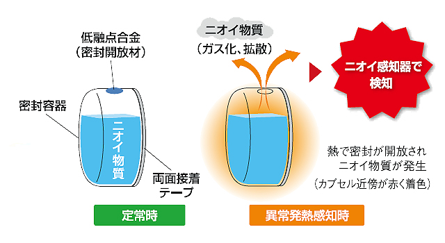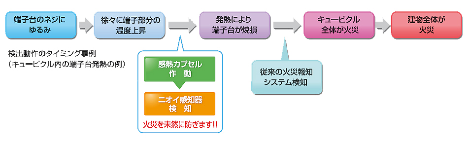 | 異常発熱監視システム 火災のわずかな兆候をいち早く検知。電気火災事故を未然に防ぎます。 電気機器の異常発熱は機器の損傷、更に停電、火災に至る可能性があり、大きな損失を与えます。 本器は異常発熱を低コストでより確実に、早期に検出するシステムです。 ![]() ■特長 ●キュービクル、配電盤内の電気機器および端子類接続部の異常発熱を早期に検知し、火災が起こる前にお知らせ。 ●低コストで電気機器の異常発熱監視が可能。 ●電機品異常を火災の前段階で検知するため、事故による被害を防止。 ![]() ●連続・集中監視による信頼性向上。 ■わずかな兆候をニオイで増幅 ●小型で電源・配線不要で取付が簡単な感熱カプセル ![]() ●動作温度に合わせて選択可能(80、100、120℃級の3タイプ) ![]() ▼感熱カプセルの取付例▼ ![]() ![]() ■ニオイ感知器で異常を検知 ●ほこりや粉塵による非火災報がありません。(※日常生活環境の中で発生する火災以外の熱や煙にて警報すること。) ●検知対象盤毎に設置することにより異常個所の特定が容易。 ●ポンプやモーターなどの可動部がないため、信頼性が高く長寿命でメンテナンスが容易。 ![]() ■ニオイセンサーの構造・原理 センサ表面にニオイ分子が吸着すると、その電気伝導度が高くなり抵抗値が低下します。その抵抗変化をブリッジ回路の偏差電圧として取り出しています。 ●鼻とニオイセンサ ![]() ![]() ■検知器仕様