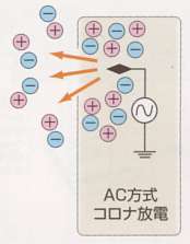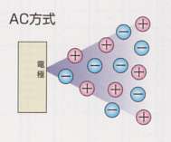 ■静電気除去のメカニズム ●イオン照射で静電気除去 帯電しやすい試料や容器の場合、特に分析天びんクラスの計量では、表示値が不安定になるなど静電気の影響を受けます。 MC20BLO-EXは、イオンバランスの良いAC方式コロナ放電で発生するイオンを照射して静電気を軽減することにより、正確で安定した測定を実現します。 @マイナスに帯電した試料 ![]() Aイオンバランスの良いイオンを発生させます。 ![]() Bイオンを照射 ![]() C極性の違うイオンのみが引き寄せられ ![]() Dプラスマイナスで打ち消され、試料は徐電されます ●イオンバランスの良いAC方式 AC方式とは、放電針に交流電圧をかけて1本の電極から+イオンと-イオンを等量出す方式です。 DC方式とは、2本の電極に+-それぞれの直流電圧をかけてそれぞれのイオンを放出する方式です。 電極が離れていると徐電範囲に制限があります。また放電針の劣化があるとイオンバランスも悪くなります。