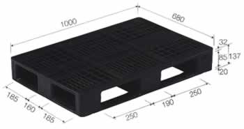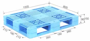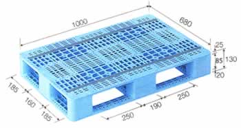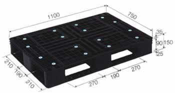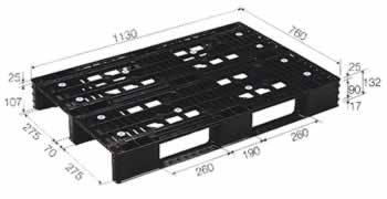 上面・下面が別形状です。 パレットの裏面はハンドリフトの使用を考慮し「田」の字構造の形状とし、フォークキャスターの逃げ面を設置しております。強度を考慮し、かつ軽量化を図ったシリーズです。 |