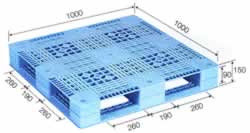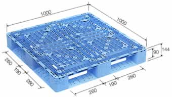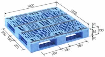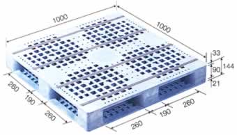 上面・下面が別形状です。 パレットの裏面はハンドリフトの使用を考慮し「田」の字構造の形状とし、フォークキャスターの逃げ面を設置しております。強度を考慮し、かつ軽量化を図ったシリーズです。 |