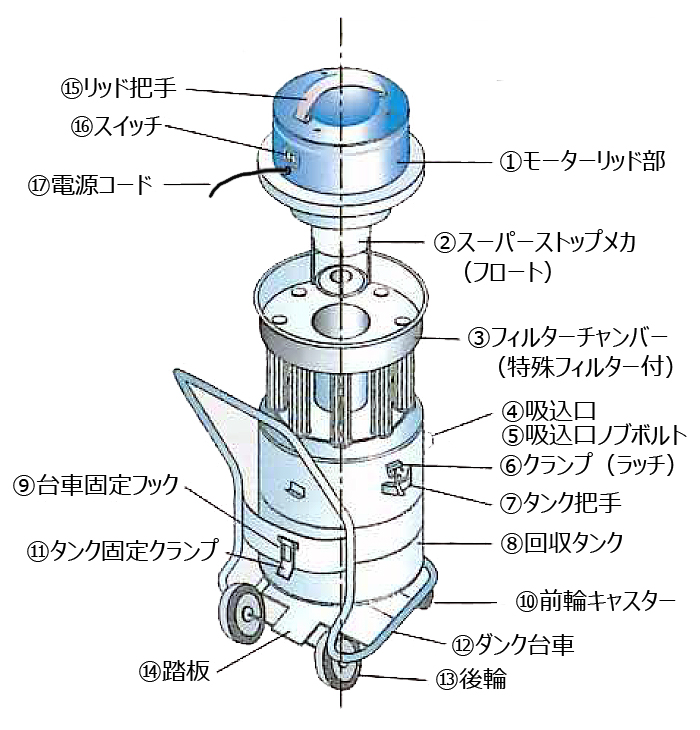 | プラスチックフィルターの乾湿両用(選択切換型) 高効率の工業用真空掃除機 ![]() ■特長 ●プラスチックフィルターの採用で、微粉じんの吸引に最適です。(捕集率:99.9% at 2.0μm) 多孔質な単層焼結プラスチックフィルターで、乾式使用時に使用します。 トナー粉など微粉塵に最適。静電気対策も考慮(導電性あり)。フィルターの目詰まりも軽減。 剥離制が良く、水洗浄が可能です。 MC3X-3030シリーズは5本、MC3X-4030/MC3X-4530シリーズは8本、MC3X-5230/MC3X-5330は10本 ※湿式使用時は取り外してください。 ![]() ●水や油、汚泥などの吸引(湿式使用)の液体ミスト対応 大風量にも対応できる新開発スーパーストップメカ(SSM2)搭載で、湿式使用時に廃棄から漏れる油や水のミスト、コンクリートなどの泥などがファンに入り込むのを防ぎます。 分解・洗浄も簡単にできます。 ![]() ●タンクフリー構造で回収物廃棄も容易に行えます。 タンクは台車から取り外せるので、面倒なゴミの廃棄が簡単に行えます。 ![]() ●透明タンクでごみが見える化 透明タンクは-40kPaの耐圧、耐衝撃性。素材は米国FDA準拠の特殊PET樹脂で、食品・薬品工場でも安心してお使いいただけます。 ![]() ●粉体~液体まで幅広い清掃作業。 ※引火性・発揮性・高温度等の危険物は吸引できません。ご相談下さい。 ■使用例 ●食品工場 きな粉・抹茶・小麦粉・コンスターチ等の微粉~食用油・洗浄水~卵の殻・崩れた豆腐・おから~割れた飴・おかきの屑~ミンチ肉。コーヒー豆の搾りかす~グリストラップの泥汚れまで。 ●産業工場 トナー・顔料・セメント・消化剤の粉・研磨粉塵・鉄粉等の微粉~油・スラッジ・金属の切削屑・油混じりの金属屑~ペレット・グリット等 食品工場・自動車製造工場・精密機械工場・金型工場・重化学工場・造船工場・車輌工場・整備工場・半導体工場・野球場・イベント会場・粉体工場・レンタルリース工場等々 ■構造図 ![]() ■標準付属アタッチメント
