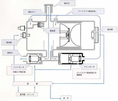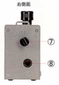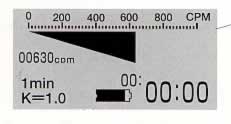 ■採気口 採気口のキャップは、採気口に一体型にし、上下スライド機構を採用しておりますので、測定中キャップが邪魔にな りません。 ●測定中は、キャップを下にスライドさせておきます。 ●バックグランド測定と感度合わせをする場合はキャップを上にスライドさせ採気口を塞ぎます。 ![]() ■表示部説明
