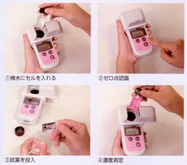 | ■特長 ●簡単操作 測定室の開閉カバーに、スライド方式を採用しましたので、着脱の必要もなく、開けて閉めるだけの簡単操作です。キー操作もワンキーで測定が行えます。 @検水によるゼロ点合わせ A検水に試薬を投入(発色) B発色した検水を測定室へ CMEASキーを押して実測 DMキーを押してメモリ保存 ●シンプル測定 「ゼロ点認識」「検水発色」「濃度測定」とシンプルな工程で測定が行えます。測定値をデジタル数値で表示しますので、目視式のような曖昧さがなくなり、水質管理等の効率アップが図れます。