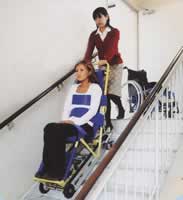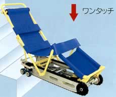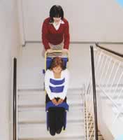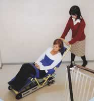 地震・火災などの災害時の非難に! 地震・火災などの災害時にエレベータが使えない状況下で歩行困難の方を1名の人員で廊下を素早く移動、階段を安全に避難させることが出来ます。 廊下を素早く移動、階段を安全に避難 ご使用は階段を降りるのみです、昇ることはできません。 |