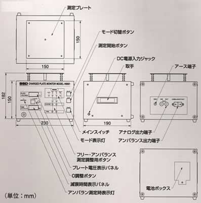 | ■特徴 ●本装置は1台で帯電プレートモニターとイオンバランスモニターの二役を兼ねています。 ●測定電圧の設定は、IECの規格(案)TC(47Sec.)1330に準拠した固定モードと自由設定モードの両方があり、工場の現場測定から研究開発まで幅広く使用できます。 ●操作は簡単で、POWERボタンを押して電源を入れ、SELECTボタンでモードを設定し、STARTボタンを押すだけで測定できます。 ●空気の流れが上からでも、また横からでも測定可能です。 ●ケースはアルミ製で軽量ですので携帯に便利です。また、塗装なしのアルマイト加工ですので傷がつきづらく、低発塵です。 ●ACアダプタ標準付属。単3乾電池4本でAC電源が無い場所でも測定可能です。 ●電圧記録、警報の外部出力端子を備えています。 ■用途 ●各種イオナイザの特性評価(ルーム用、テーブル用等) ●空間のイオンバランス監視 ●人体帯電のピーク電圧表示 ●摩擦帯電、静電誘導等の測定 ●各種静電気対策用品(服、靴、マット等)の評価 ■外観図 ![]() ■仕様