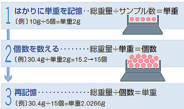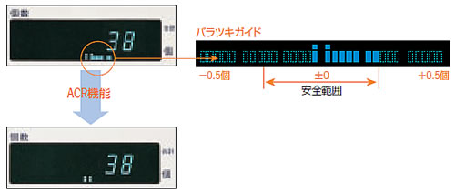 ■個数を数えるには、計数対象の重量を個数に換算するため、バラツキ状況を考慮した単重(1個の重量)を求めることが重要です。 そこで、「AISCS機能」の自動サンプリングとバラツキ補正により、正確に単重のサンプリングを行います。また、「ACR機能」により、バラツキ状況に応じて自動的に誤差の補正を行い、正確に個数を数えます。 ●「AISCS機能」・・・AI(バラツキ補正)+SCS(自動サンプリング方式) 最初に5個を載せるだけで、サンプルの重量とバラツキ状態を判断して追加する数量を表示します。その表示に従ってサンプルを追加すれば、最適な状態でサンプリングができます。 ![]() ![]() ●一目でわかる「バラツキガイド」と「ACR機能(自動個数誤差補正機能)」で、計数誤差ゼロを実現! 個数はかりは、重量を個数に換算するため、換算個数に“端数(小数点以下の個数)”が生じます。従来のはかりでは端数を四捨五入するだけなので、バラツキ状態によっては誤差がでる可能性がありました。 新光電子の個数はかりは、端数を「バラツキガイド」でバーグラフ表示します。バラツキガイドの端数が安全範囲内にある時にデータが安定すると、自動的に端数をゼロにする「ACR機能(自動個数誤差補正機能)」が働き、正確な計数作業ができます。 これを繰り返せば、バラツキの大きな品物も誤差を取り込まずに正確な計数作業ができます。〔ACR機能は特許 第4208662号〕 ※ACR機能は設定を切り替えてOFFにすることもできます。 ![]() ■寸法図 ![]() ![]() ■仕様