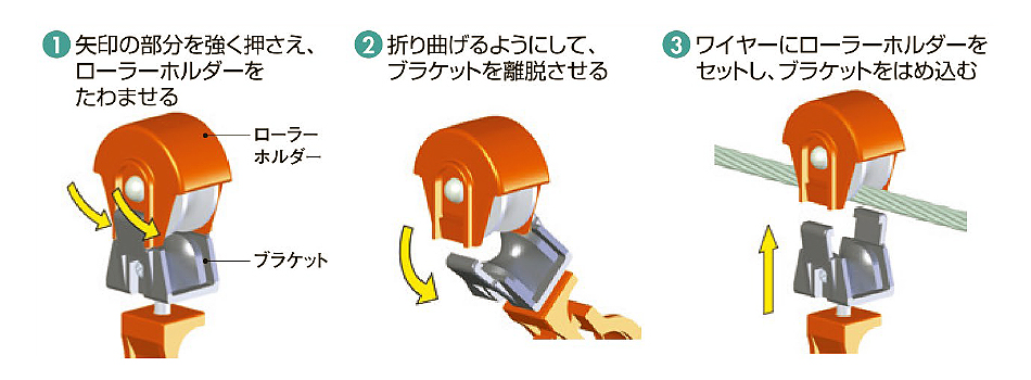 取り付けはワンタッチ方式。 ケーブルの取り付けは工具なしでワンタッチで行えます。ビスやナットの脱落がないので、高所での作業は安全です。 |
