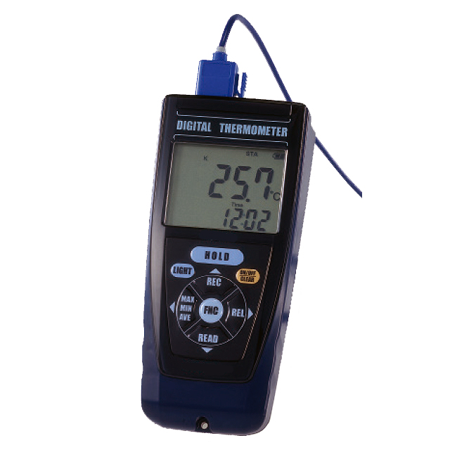 見やすい大形液晶表示(バックライト付)のハンディ温度計です。 計測データは最大20データを本体にメモリーできます。 熱電対K、T、測温抵抗体Pt100のマルチレンジ入力