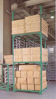 ●柱部・ベース部に角パイプを使用。 頑丈で耐震性にも優れています。 ●レール方式で段積みが簡単。 1パレット1,000kgで、 4R段積が可能です ●多彩なオフションを語用意しました。 (サイドワク付・中間棚付・フォークガイド付・床面合板・鉄板張など) ■使用例:段ボール箱の保管 ![]() ■組立式テナ仕様