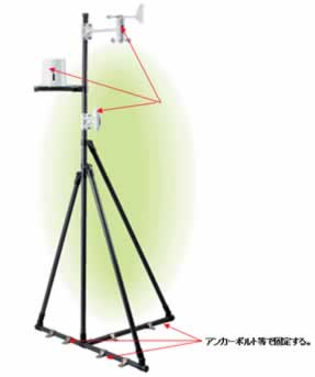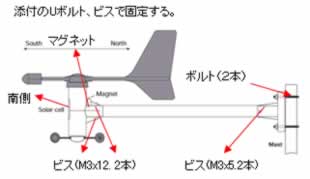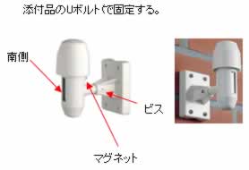 ■屋外センサー取り付け ●雨量計 雨量計の上蓋を外し、底蓋を添付のビスにて固定する、水平を保ち水はけを良くする。 ![]() ■専用タワー(MD2K-22-TOWER)(オプション) ![]() ■風向、風速センサー ![]() ■屋外気温、湿度センサー ![]() ■無線屋内温湿度センサー(MD2K-22-22TP) 屋内や暗室及び冷蔵庫、ビールハウス等太陽電池センサーを使用出来ない場所に設置しデータを発信します。 ![]()