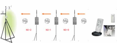 ■中継器(MD2K-22-12K) 各センサーと気象モニター及びインターフェス間の通信距離を延長したい時使用します。 通信距離は直線無障害で約20m位です。 台数は任意に増設可能ですが、通信速度が1台で約0.1秒遅れます。 又2台以上増設の場合は各々にアドレスを与えるため中継器内でジャンパー設定を行ます。 ●中継器設置順序はモニター、インターフェス側からNO-0. NO-1. NO-2 NO-3.--です。 ●中継器は屋外用(防滴)の構造になっております、もちろん屋内にも使用できます。 ![]() ■ジャンパー設定 ●電地交換は電池蓋のビス4本を緩め乾電池単2を2本セットする。寿命約1年です。