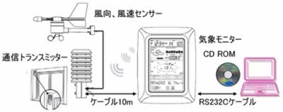 | ■概要 本装置は風向、風速センサー、気象モニター、通信トランスミッター及びモニター内臓の気圧センサーから構成されて おり、有線、無線の何れかで各々の計測値をタッチパネル採用の液晶モニターに表示します。又、気象データはモニ ター内蔵メモリー(EEPROM)に保存され、添付のRS232Cケーブルをパソコンに接続してグラフや表を作成できます。 尚、メモリーはEEPROM搭載の為電源がOFFになってもデータは保存されます。気圧変動や天気アイコン、時計機能 等があり便利なデータロガーです。 ![]() ■仕様