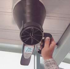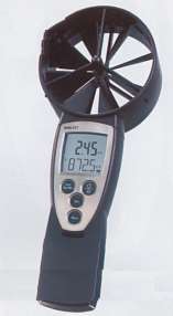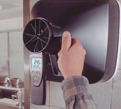 | <機能> ●気流の方向(吹き出しor吸い込み)を、ディスプレイに表示 ●1台で、風速・風量・温度を計測 ●ポイント平均・時間平均計算機能 ●最大値・最小値の表示 ●ホールド機能 ●見やすいバックライト付ディスプレイ ●オートオフ機能 ■ベーン式センサ 径の大きなベーンセンサは(φ100mm)は、吸気口などでの、低風速・中風速の乱流計算に適しています。 ベーン式風速計は気流によって回転したベーンの回転数を、パルス信号に変換することによって風速を計測します。 ダクト内では大きく変動します。径の大きいベーンセンサは グリッドから発生する乱気流の平均速度を計測することができるため、排出口での風速計側に最適です。 ![]() ■ダクトの排出口や吸入口での風速・風量計測に最適です。