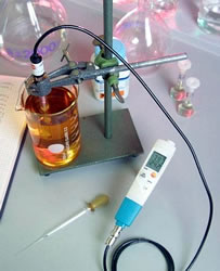 | ■用途 pH測定は食品業界、化粧品産業、ヘルスケア、空調事業など幅広い分野において、製品の品質を保証する重要なパラメータです。プローブ接続式のMD34O206-3は、様々なプローブを接続して多用途に使える高性能なpH測定器です。 ![]() ■特長 ●MD34O206-3の主な特長は、BNCソケットがついており、様々なプローブと接続できることです。pHプローブには、液体用の他、固形〜半固形の食品用や、ラボでの測定用にガラス電極プローブなどがあり、用途に合わせて選ぶことができます。 ![]() ●温度センサ一体型のpHプローブを使うと、温度補償機能によりpH値の補正が自動的に行われます。温度センサがついていないプローブの場合は、手動でpH値の補正が可能です。 ●測定値が安定状態になると、自動的にその数値が固定表示されるオートホールド機能で、測定プロセスが容易になります。付属のTopSafeプロテクタを装着時の防水仕様はIP68で、汚れや水、衝撃から本体を守ります。プロテクタを装着すれば、屋外や工場現場などの環境でも使用できます。 ※プローブは別売りです。MD34O206-3をお求めの際は別途pHプローブもご注文ください。 ■仕様