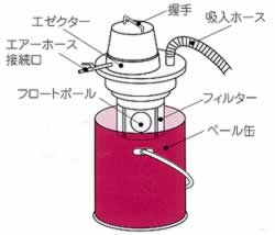 | ■特長 ●独自のエアーエゼクター機構 コンプレッサーから供給された高圧エアーがエゼクターを通過する時にペール缶内に安定した真空状態ができると共にエアーが増幅されて吸引風量が発生します。 ●防爆仕様 コンプレッサーエアーのみを使用し、電気や回転部がないので発火の心配がありません。 ※モーター式のようにクリーナーが原因となる発火の要素がないという事で、吸引物が原因と なる発火はこの限りではございません。 吸引時の静電気などが原因で粉じんが発火する可能性はございます。 ●小型・軽量で持ち運びが簡単 狭い場所でも自由に使えます。また、ペール缶がそのままゴミ処理器に使えますので予備のペール缶をご用意になれば能率的に大量の廃棄物処理が行えます。 ![]()