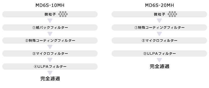 | ■特長 強力な吸引力と特殊フィルターシステムによって0.1ミクロンのチリ、細菌を99.99%キャッチします。排気は完全クリーンエアーでチリや細菌が室内に飛散しません。 ●紙パックフィルター(MD6S-10MHのみ) 粒径の大きな粉塵はすべてこのフィルターに回収されます。脱着が簡単で回収物の取り出しが楽にでき、手を汚さずに回収できます。 ●特殊コーティングフィルター 従来のバッグフィルターと異なり、フィルターの表面を特殊加工しているため、微粉塵が付着しにくいだけでなく、ミクロン単位の微粒子を濾過することができます。 ●マイクロフィルター 特殊コーティングフィルターを通過した微粉塵中の0.3ミクロンまでの微粒子を捕集します。 ●ULPAフィルター 0.1ミクロンまでの微粉塵、バクテリア、カビ胞子などさまざまな微粒子を99.99%以上回収します。 ●静かな運転音(68dB (3m)) ●モーター保護機能付き ●低風速排気 上部排気口から6cmのところで排気風速0.3m/sec、床面などのホコリを飛散させません。 ■用途 ●電子工業・精密工業のクリーンルーム清掃 ●食品工場の防カビ対策 ■タイプ