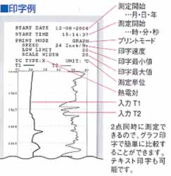 | ■プリンター内蔵 リアルタイムにグラフまたはテキストでプリントアウト。 ![]() ■専用ケース付 ![]() ■セット内容 ●デジタルレコード温度計本体×1台 ●コネクター変換プラグ×1本 ●K熱電対素線プローブ×2本 ●解析用ソフト(CD-ROM)×1枚 ●RS232Cシリアルケーブル×1本 ●専用プリンタ用紙×3本 ●サンプル用乾電池×6本 ●取扱説明書×1冊 ![]() ■仕様