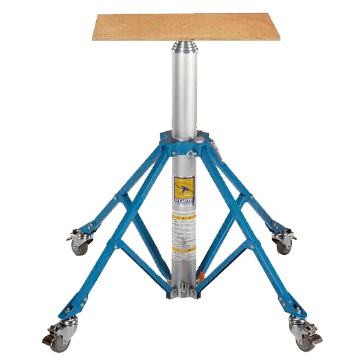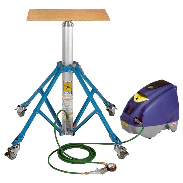 | エアコン・室内外機の据付に最適 洗練された荷揚機、抜群の安定性! 本機は人の昇降には使用しないで下さい。 ![]() ■特長 ●ワンタッチ開脚 開脚、閉脚が簡単にレバー操作で行えます。 ![]() ●現場に応じてセーフティラインの範囲内で開脚幅を調整できます。 ![]() ●安定性 独自の支柱形状により抜群の安定性をほこります。 ![]() ●リリーフバルブ 作業中に異常な空気圧がかかっても、安全弁の働きで余分な圧力を外へ逃します。 ![]() ●突き上げ防止機構 ロープの併用で天板の突き上げを防止します。 ![]() ●圧力ゲージ付コントロールバルブ コントロールバルブに圧力ゲージを装着していますので、空気圧チェックで作業の安全確認ができます。 ![]() ●車輪ストッパー キャスターにストッパーがついているため、脚部はしっかりと固定します。 ![]() ●簡単セッティング セッティング、取り外しがとても簡単です。 ![]() ■用途 ●空調用ダクトの据付に ●ガス・水道等の配管工事に ●ビル・工場内のメンテナンス作業に ●その他、重量物の揚げ降ろしに ●照明器具の取付等の電気工事に ![]() ■寸法図 ![]() ■タイプ